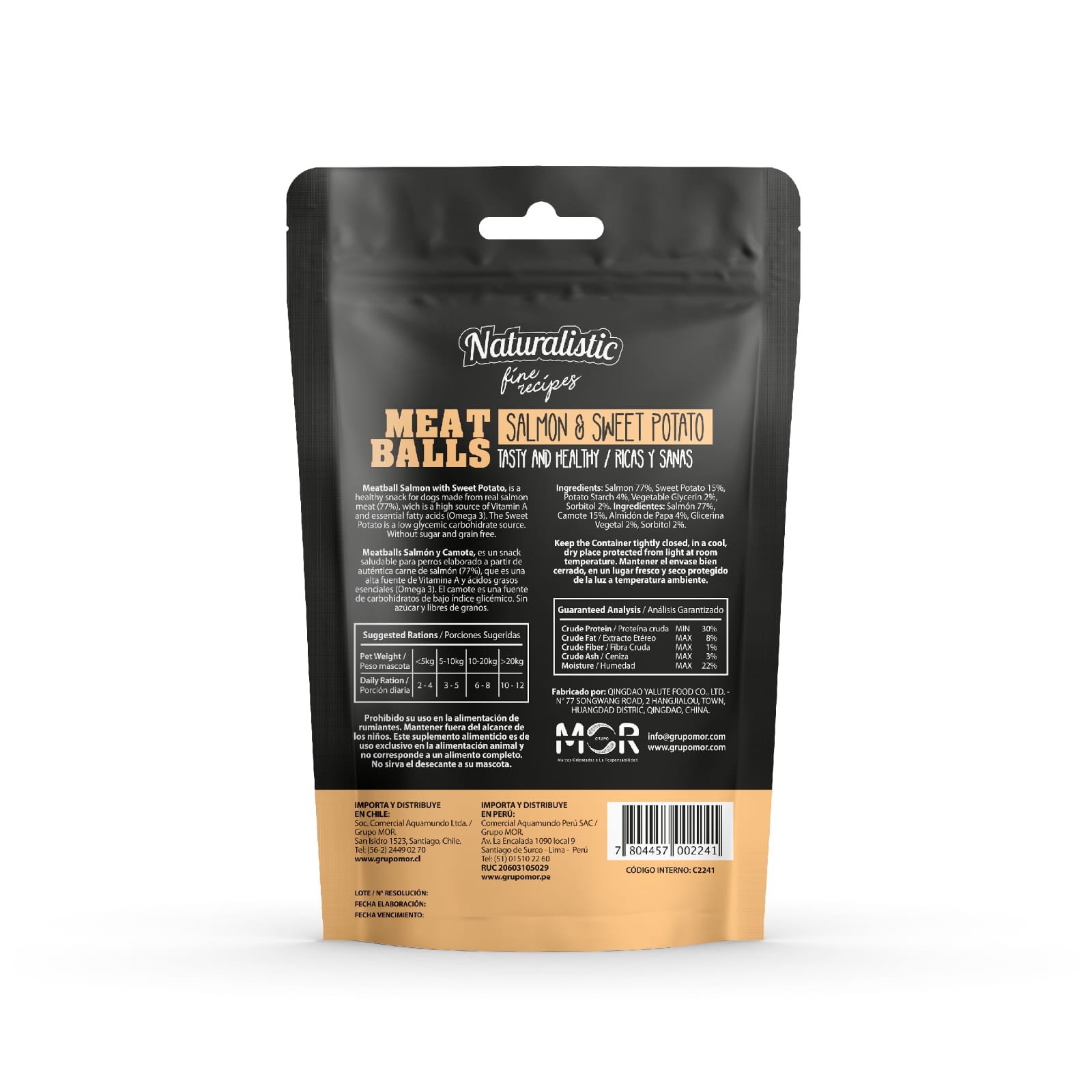 Ingredientes: Salmón 77%, Papa Dulce 15%, Almidón de Papa 4%, Glicerina Vegetal 2%, Sorbitol 2%.