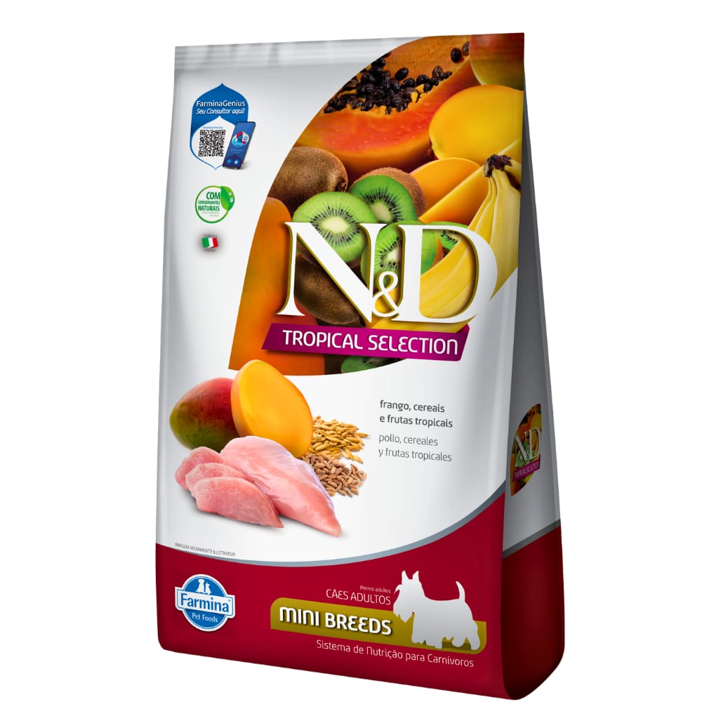 N&D Tropical Canine Frango Adult Mini es un alimento diseñado especialmente para perros adultos de razas pequeñas. Formulado con ingredientes de alta calidad, este alimento proporciona una dieta completa y equilibrada que combina proteínas de origen animal, carbohidratos de bajo índice glucémico y una exquisita mezcla de frutas tropicales. Con proteína de pollo deshuesado (20%) y pollo deshidratado (20%) proporciona una fuente magra y altamente digestible de proteínas para el desarrollo y mantenimiento muscular. Con un mezcla de frutas tropicales (plátano, kiwi, mango, papaya y piña) ricas en antioxidantes, vitaminas y minerales que refuerzan el sistema inmunológico y promueven una piel y pelaje sanos. Glucosamina y condroitina para mantener la salud de las articulaciones y la movilidad.