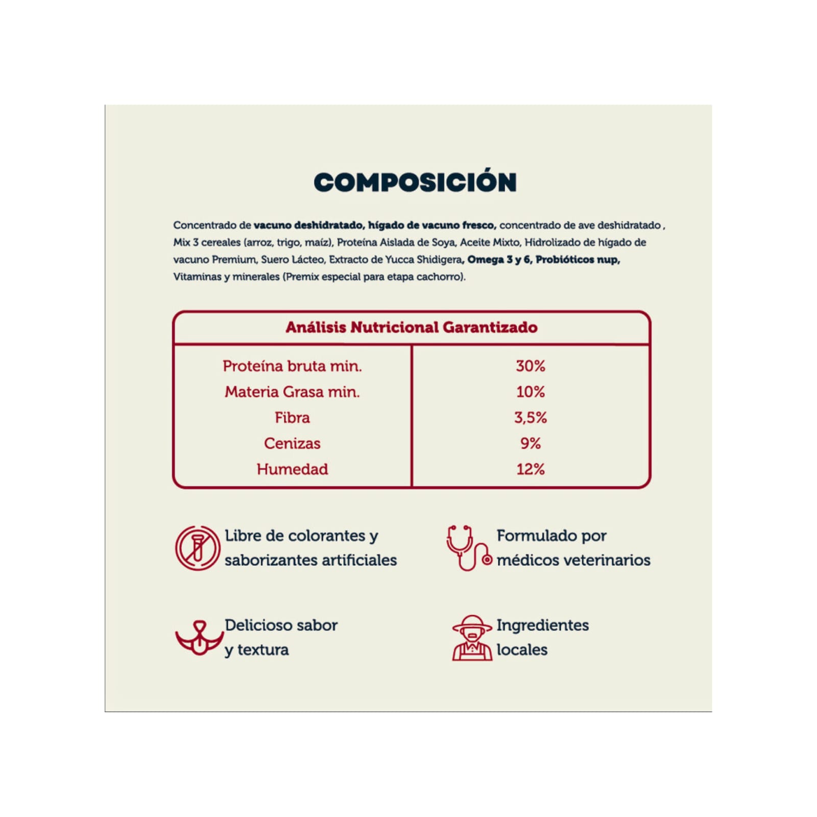 Concentrado de vacuno deshidratado, hígado de vacuno fresco, concentrado de ave deshidratado, Mix 3 cereales (arroz, trigo, maíz), Proteína Aislada de Soya, Aceite Mixto, Hidrolizado de hígado de vacuno Premium, Suero Lácteo, Extracto de Yucca Shidigera, Omega 3 y 6, Probióticos nup, Vitaminas y minerales (Premix especial para etapa cachorro). .