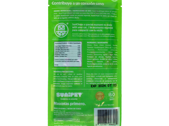 Recomencaciones: La ingesta diaria es acorde a la dieta o necesidad de la mascota. Ingredientes: Agua, Atún, Extracto de almeja, Taurina, Tapioca, Goma xantana, Aceite de oliva, L-lisina, Glicina, Cloruro de potasio, fructooligosacárido, extracto de té verde.